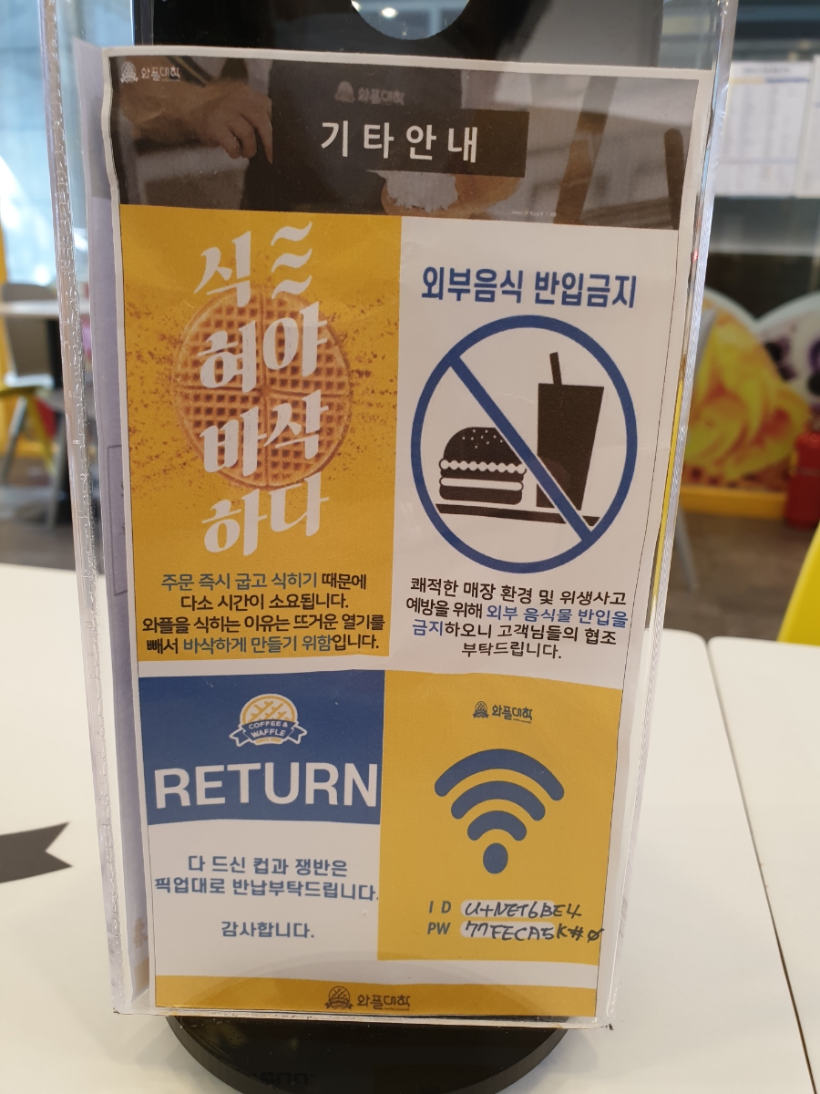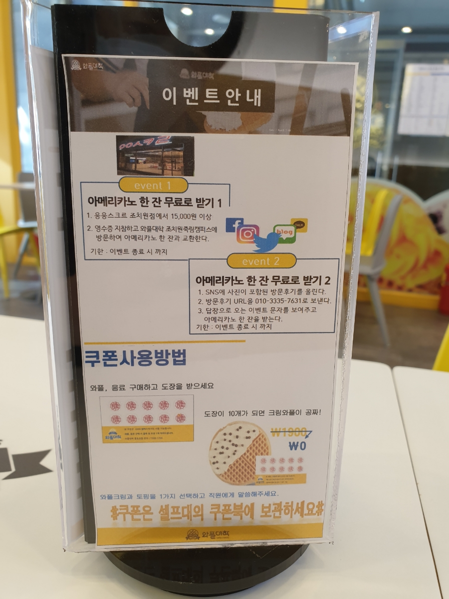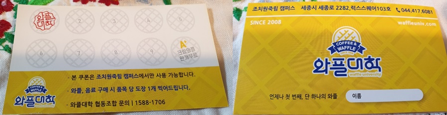 와플 대학 쿠폰을 받아서 구입할 때마다 도장을 꽝 꽝 찍음 금방 채워져 도장 10개째에 크림 와플이 하나 제공된답니다. 와플, 음료 구매 시 품목 당 도장 1개니 금방 될 듯합니다^^